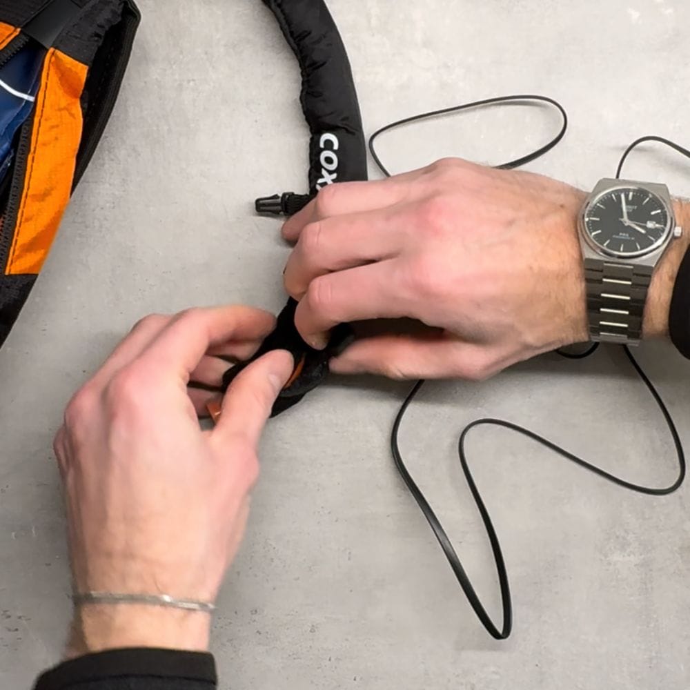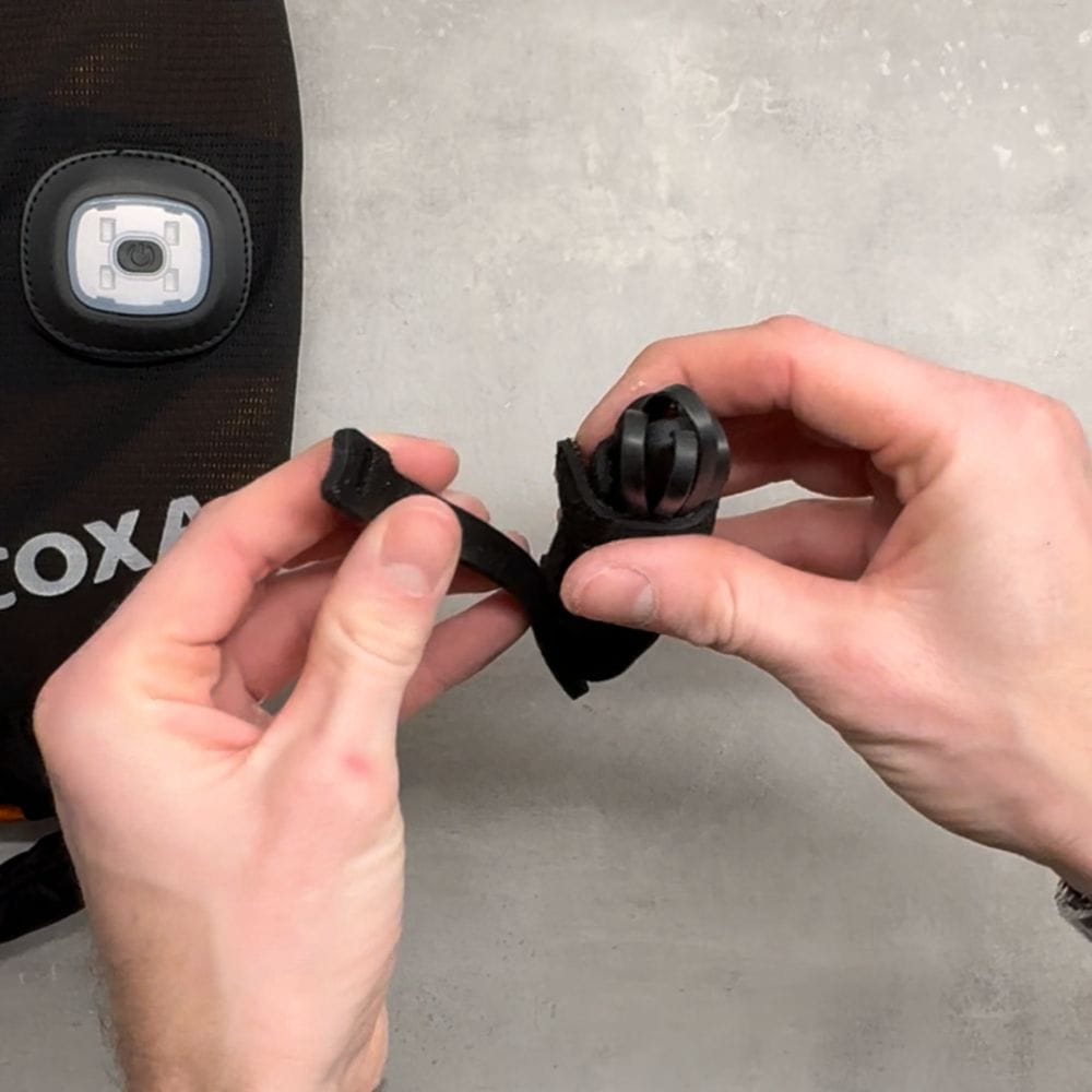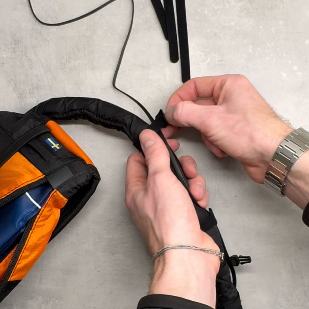 Börja med att ta loss och separera de kardborreband som ingår, dessa används senare för att fästa sladden runt slangen.