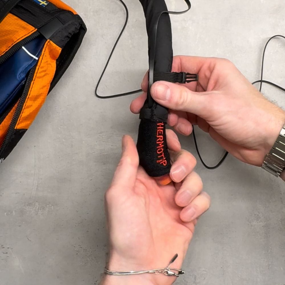 Om du har en isolerad slang kan du med fördel fästa det isolerade överdraget ovanpå Thermotip och dra sladden genom kardborrebandet.